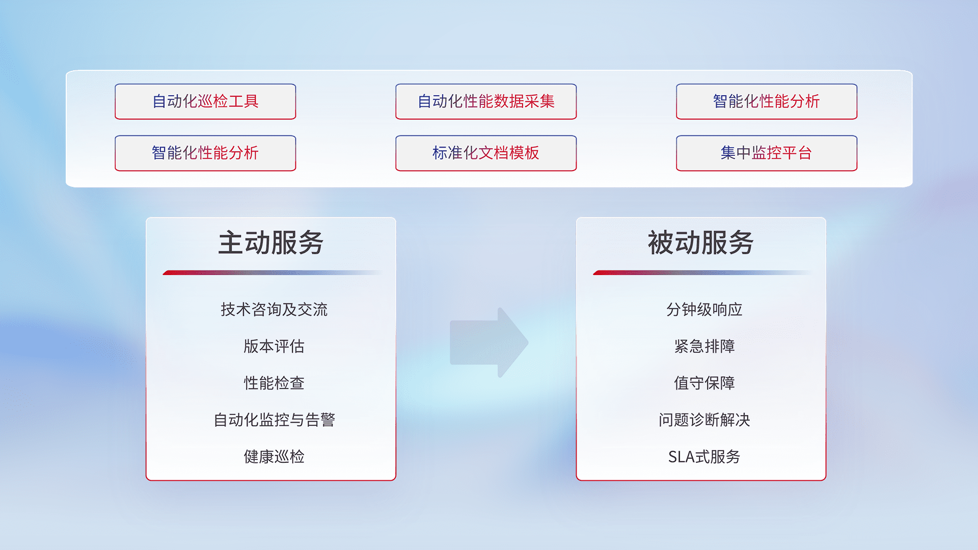 智能化工具和标准化文档,,保障服务质量,,提供主动服务(包含技术咨询、、、、版本评估、、、性能检查、、、自动化监控与告警、、、健康巡检)和被动服务包含(分钟级响应、、、紧急排障、、、值守保障、、、、问题诊断解决、、SLA服务)。。